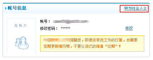 进入《个人管理中心》,位于左上角《帐号信息》版块,点击《转为社会人士》,如下图所示: